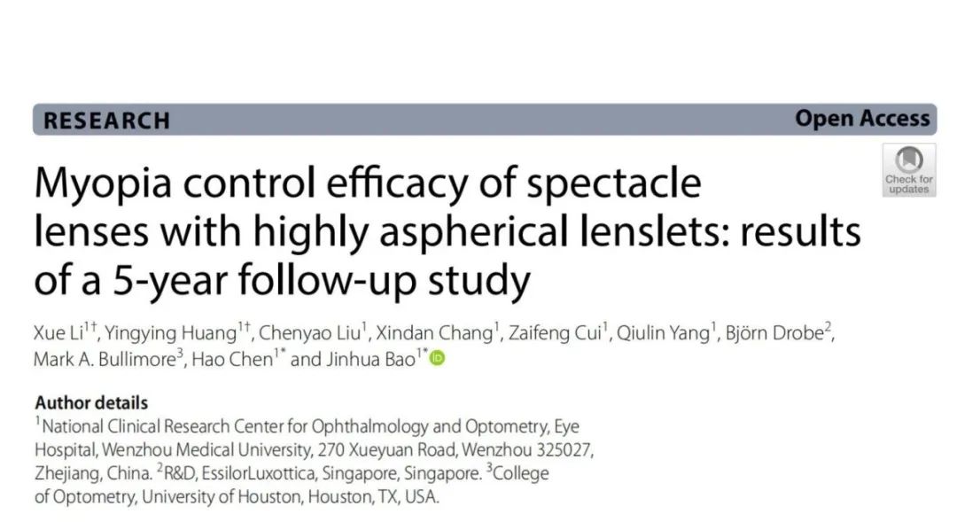 近视防控领域的光学及药理学干预策略虽已取得显著进展,但当前研究仍面临两大核心挑战:其一,多数随机对照试验(RCT)的观察周期集中于1-2年,缺乏长期(≥5年)的纵向数据支撑;其二,传统临床试验设计中对照组持续暴露于非干预状态引发的伦理困境。针对上述问题,近期关于高非球微透镜技术(High Aspheric Micro-Lens Technology, HAL)的5年期前瞻性队列研究提供了创新性解决方案——通过外推单光框架眼镜组(Extrapolated Single-Vision Spectacle Lenses, ESVL)模型实现长期疗效评估与伦理规范的平衡。该研究验证了光学干预联合纵向数据建模在长期疗效评估中的可行性,为破解"疗效验证需求"与"受试者权益保护"之间的矛盾提供了可复制的范式。