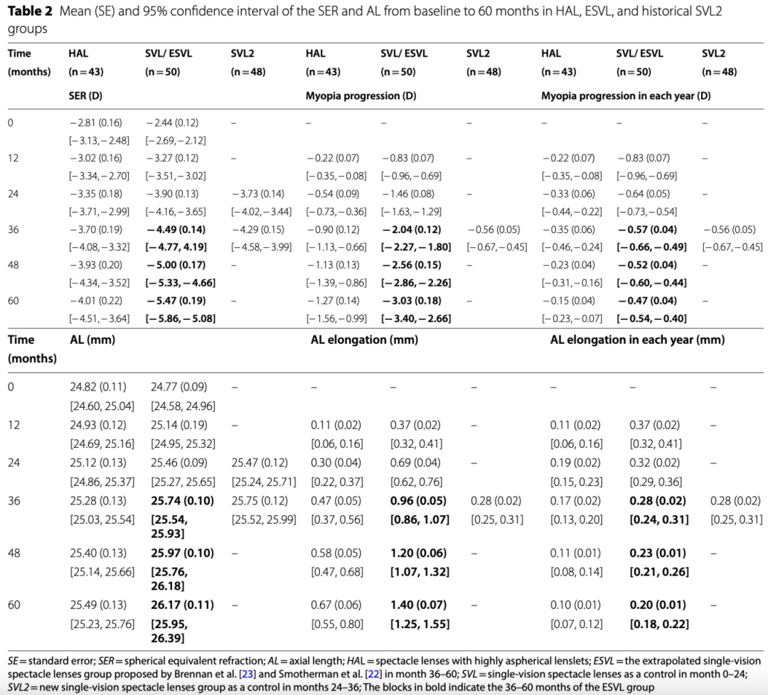 2. ESVL组的设计:ESVL组5年内等效球镜度(SER)和眼轴长度(AL)变化的推断,基于同一临床试验中SVL组最初2年的数据。后续3年,预计SER进展平均每年降低9.7%,AL增长每年减少15%。通过比较3年推断期第1年的近视进展和AL增长变化与RCT 1年扩展研究中SVL2组数据,评估ESVL组的有效性。