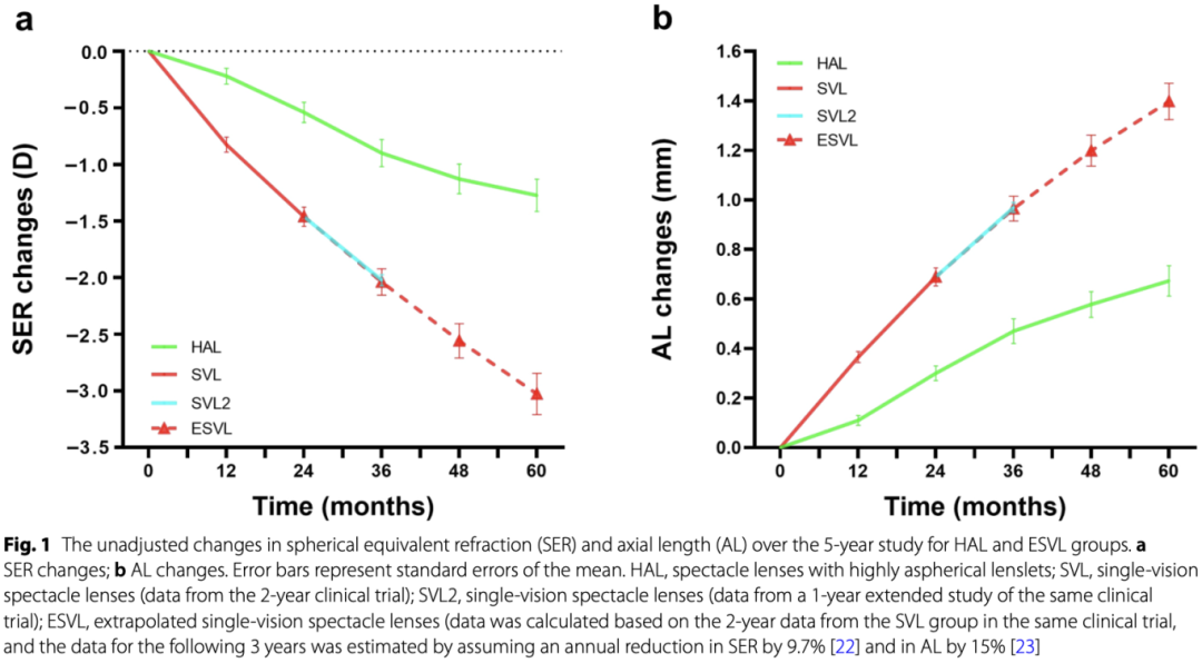 见上表2和下图1,HAL组5年的SER平均变化为-1.27±0.14D,AL平均变化为0.67±0.06mm。与ESVL组相比,HAL组5年近视进展显著更少,平均差异为1.75±0.24D,眼轴平均增长显著低于ESVL组,差异为0.72±0.10mm。