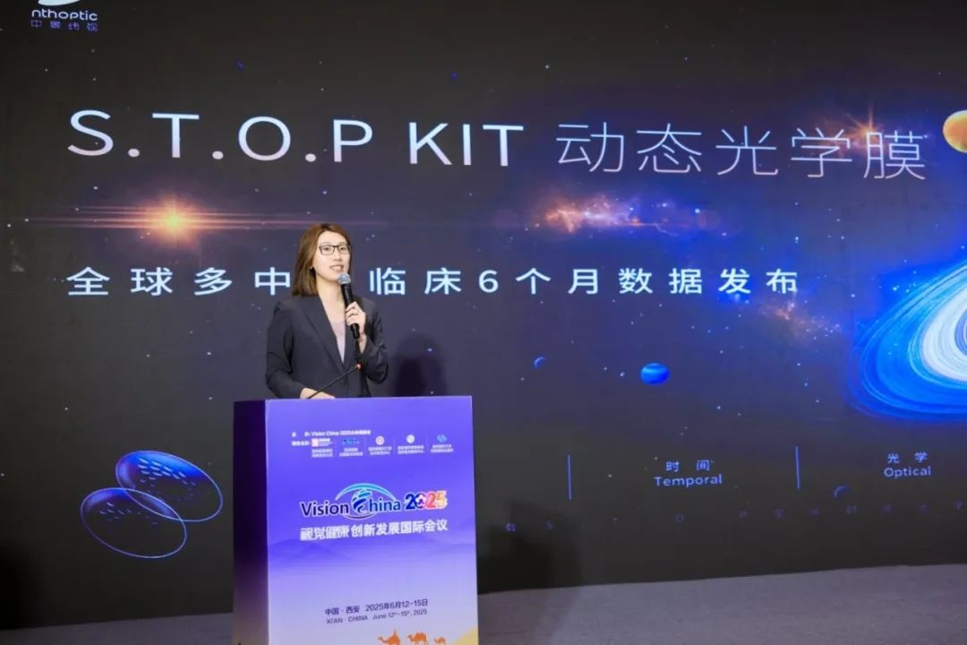 展会期间的重磅环节——S.T.O.P KIT戴美克动态光学膜全球多中心临床研究(6个月)数据新闻发布会盛大召开。中景纬视副总裁兼CMO李哲闯博士作为主讲人,向全球与会者正式公布了这项严谨临床试验的阶段性核心成果。在国内两家中心(复旦大学附属眼耳鼻喉科医院、天津市眼科医院)160例样本量,为期6个月的RCT试验中,S.T.O.P KIT延缓眼轴增长高达67%(相较于单光镜对照组),且主观视觉质量优异。李博士详细解读了该数据的统计意义和临床价值,强调其在光学近视防控产品中属于安全且有效的产品,突显了产品的巨大潜力。 此次6个月数据的成功发布,为验证S.T.O.P KIT动态光学膜的有效性和安全性奠定了坚实的循证医学基础,标志着近视防控领域动态光学干预新时代的重要一步。