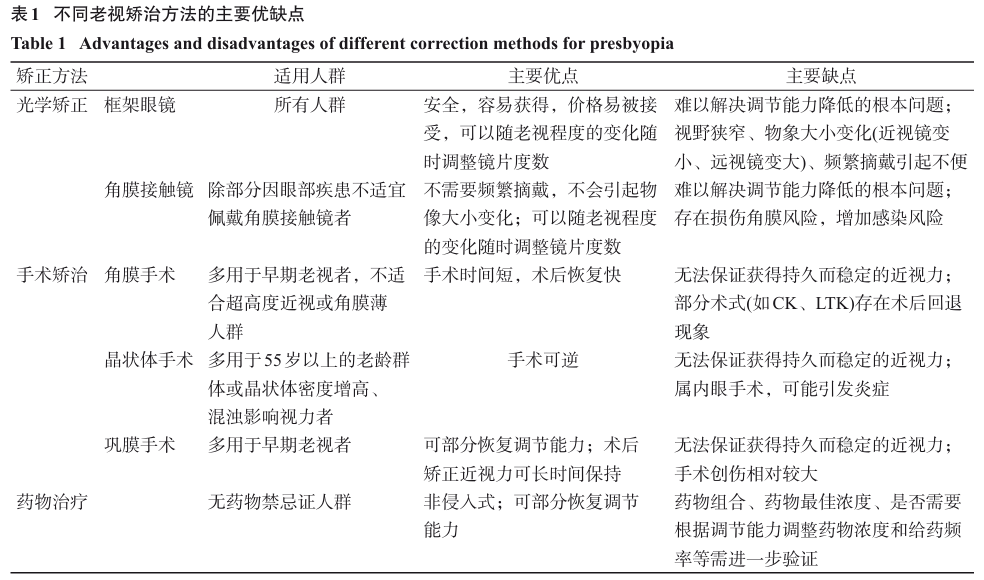 老视的治疗和矫正仍然具有挑战性,因为目前尚无能够在所有距离都实现完美视力且无风险的药物或手术方法,目前常用的矫正方法有光学矫正、手术矫正和药物治疗。