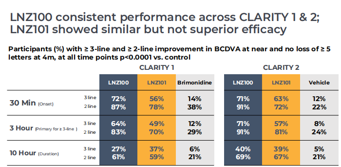 两款Aceclidine眼药水配方在治疗老花眼的临床2期试验中展现积极结果,两款配方为LNZ100(1.75%aceclidine)与LNZ101(1.75% aceclidine & 0.08% brimonidine)皆以aceclidine为主要成分。试验结果表明LNZ100与LNZ101配方在不影响患者远视力的情况下,患者的近视力可在使用眼药水后30分钟内显著改善,且疗效可维持10个小时。