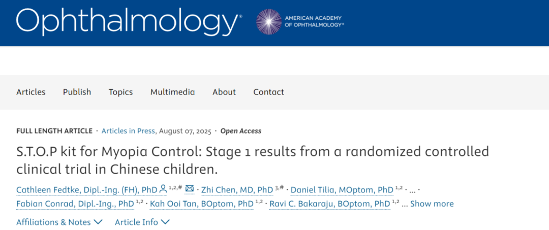 S.T.O.P KIT时间空间光学相位技术,在中国完成的第一阶段随机对照临床试验取得突破性成果。该中国区研究由复旦大学附属眼耳鼻喉科医院陈志教授与天津市眼科医院李丽华教授为主要研究者,在上海及天津多家临床中心联合开展,相关论文已于2025年8月7日在线发表于眼科领域国际权威期刊《Ophthalmology》。