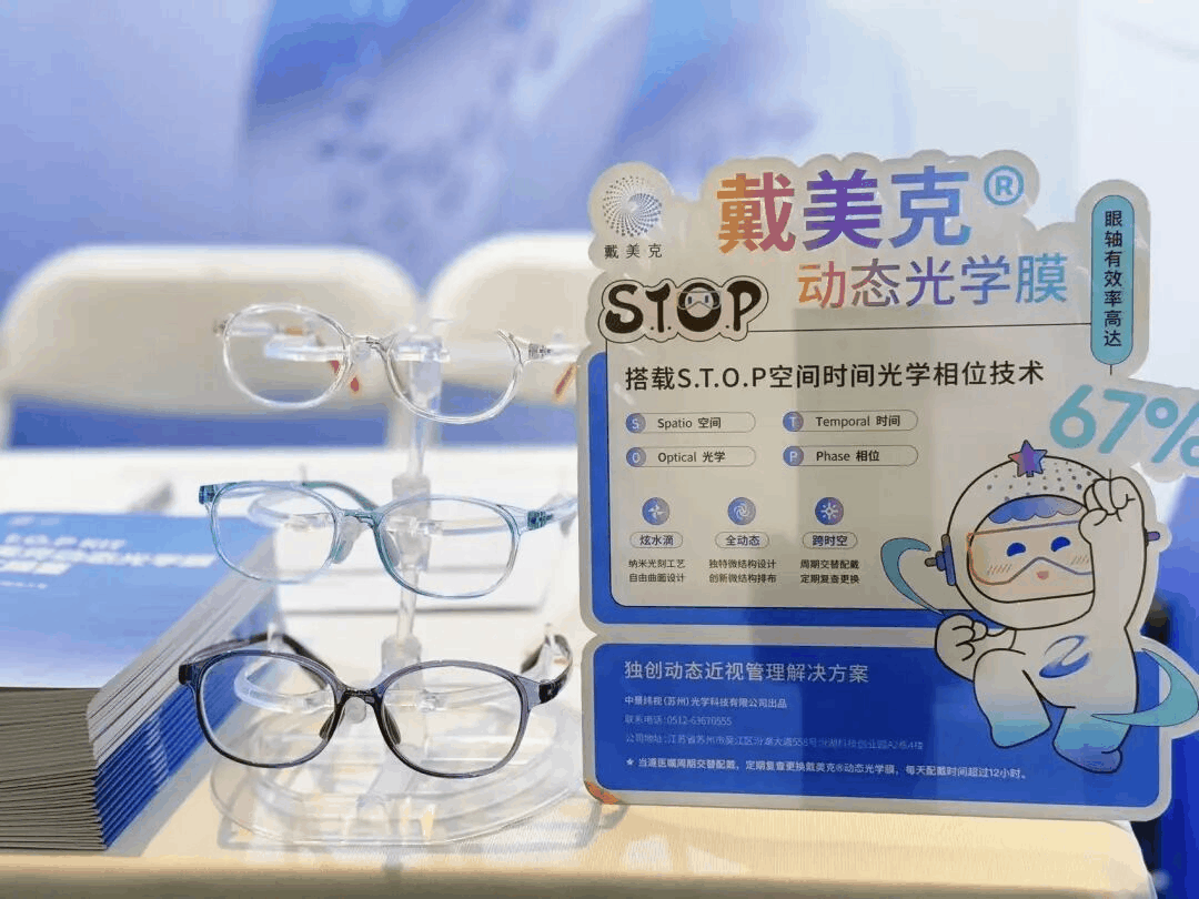 在展会现场,戴美克®动态光学膜的 “S.T.O.P KIT”空间时间光学相位技术成为热议核心。这款可贴附于普通单光镜片的高科技光学膜,通过三大创新设计突破传统静态局限: